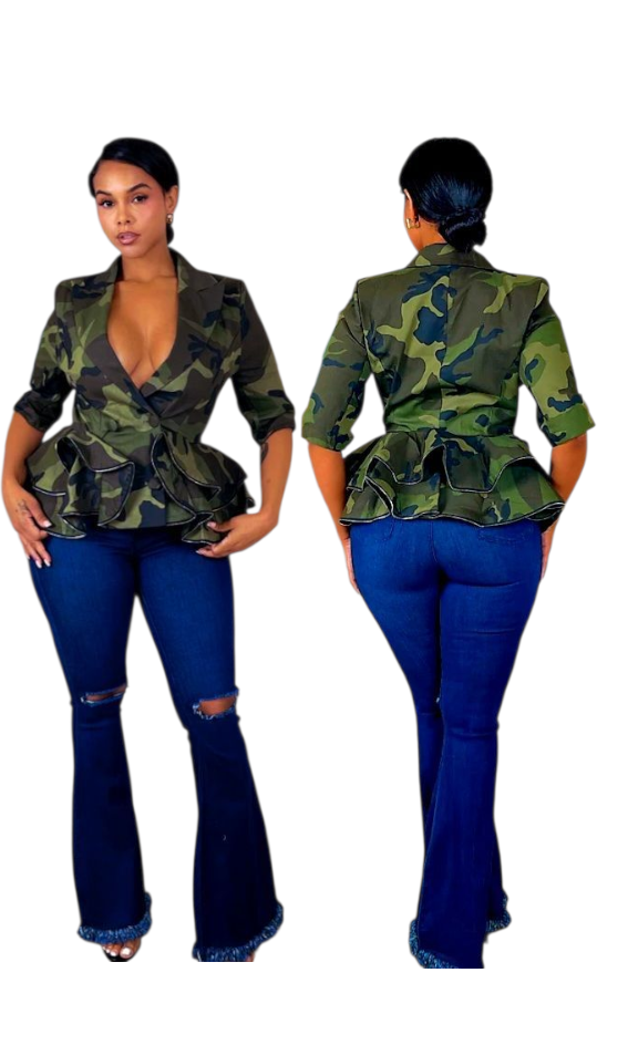 Bold + chic! Tailored camo print jacket with peplum ruffle waist and deep V neckline. Versatile, stylish, and full of attitude—this camo jacket is a wardrobe must-have! Perfect for day-to-night style.